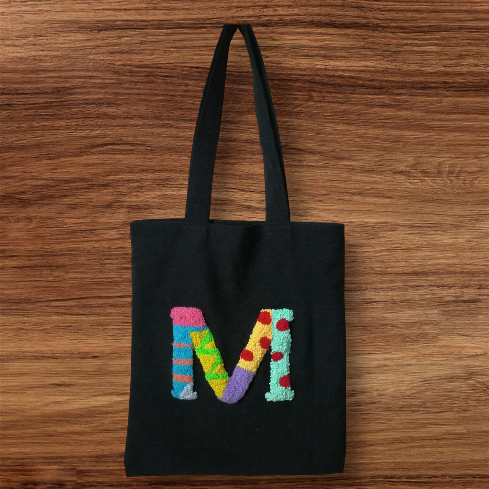 شنطة توتي باج باللون الاسود والتطريز بألوان مبهجة حرف M