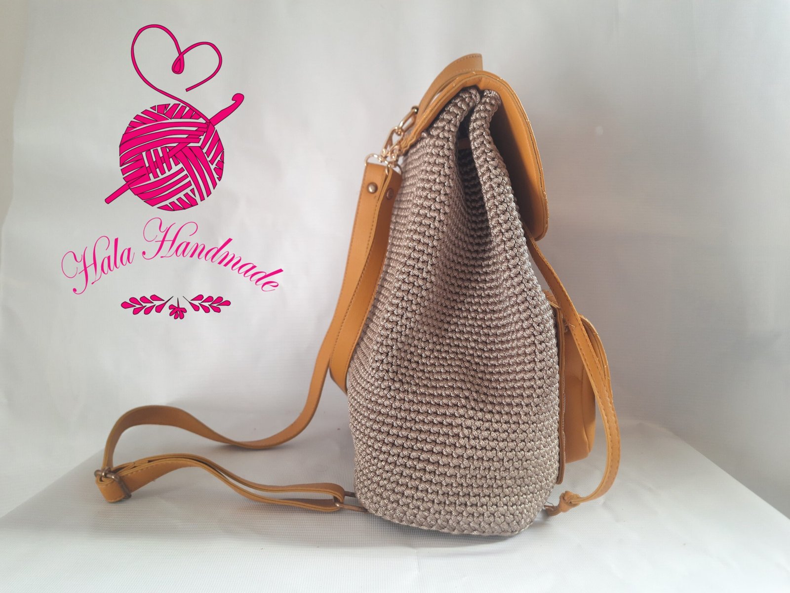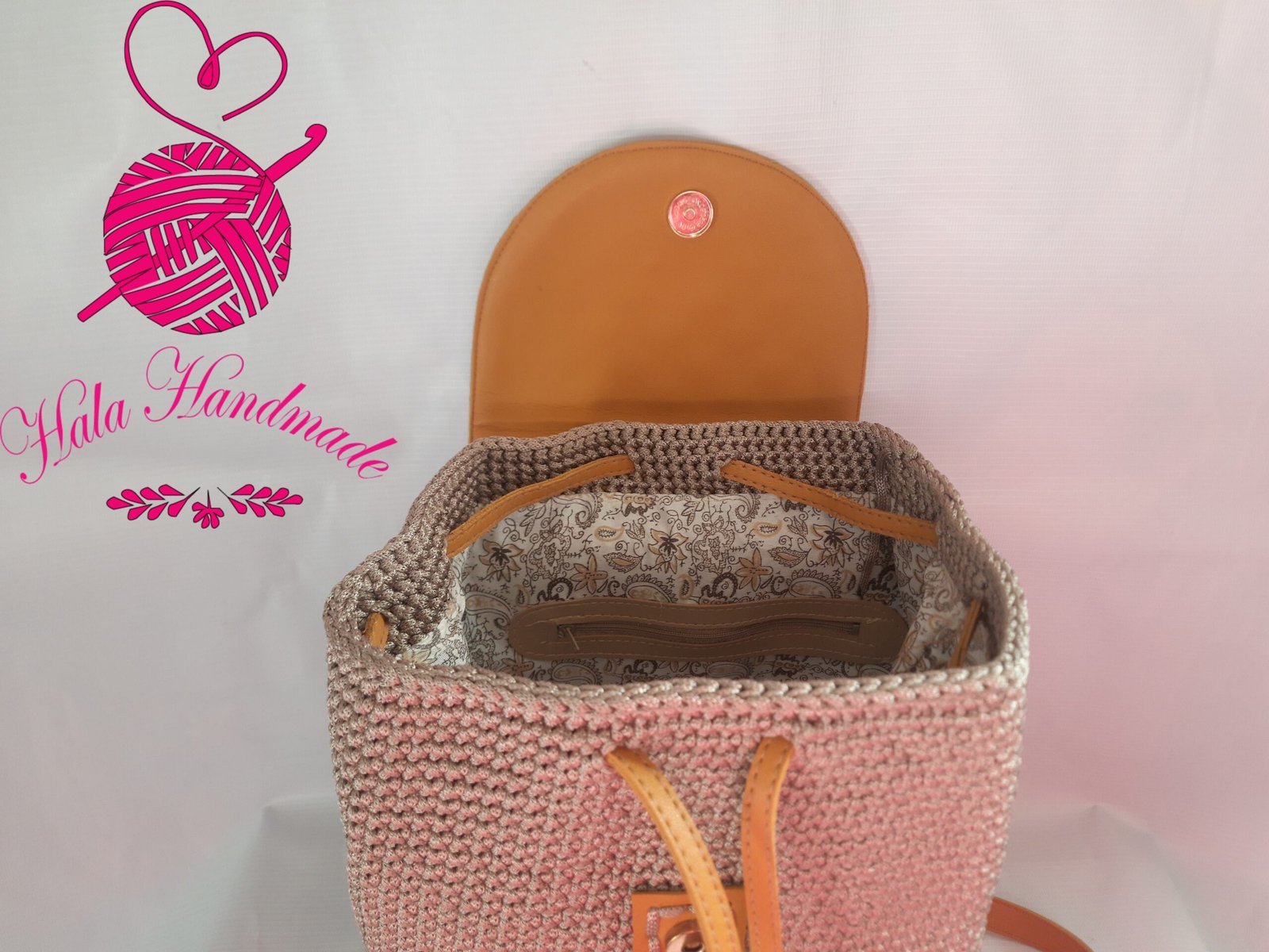 شنطة كروشيه ظهر أنيقة تجمع بين الكروشيه اليدوي والجلد الفاخر، بتصميم عملي مع جيب أمامي للحركة اليومية، تضيف لمسة من الرقي والتميز لإطلالتك.