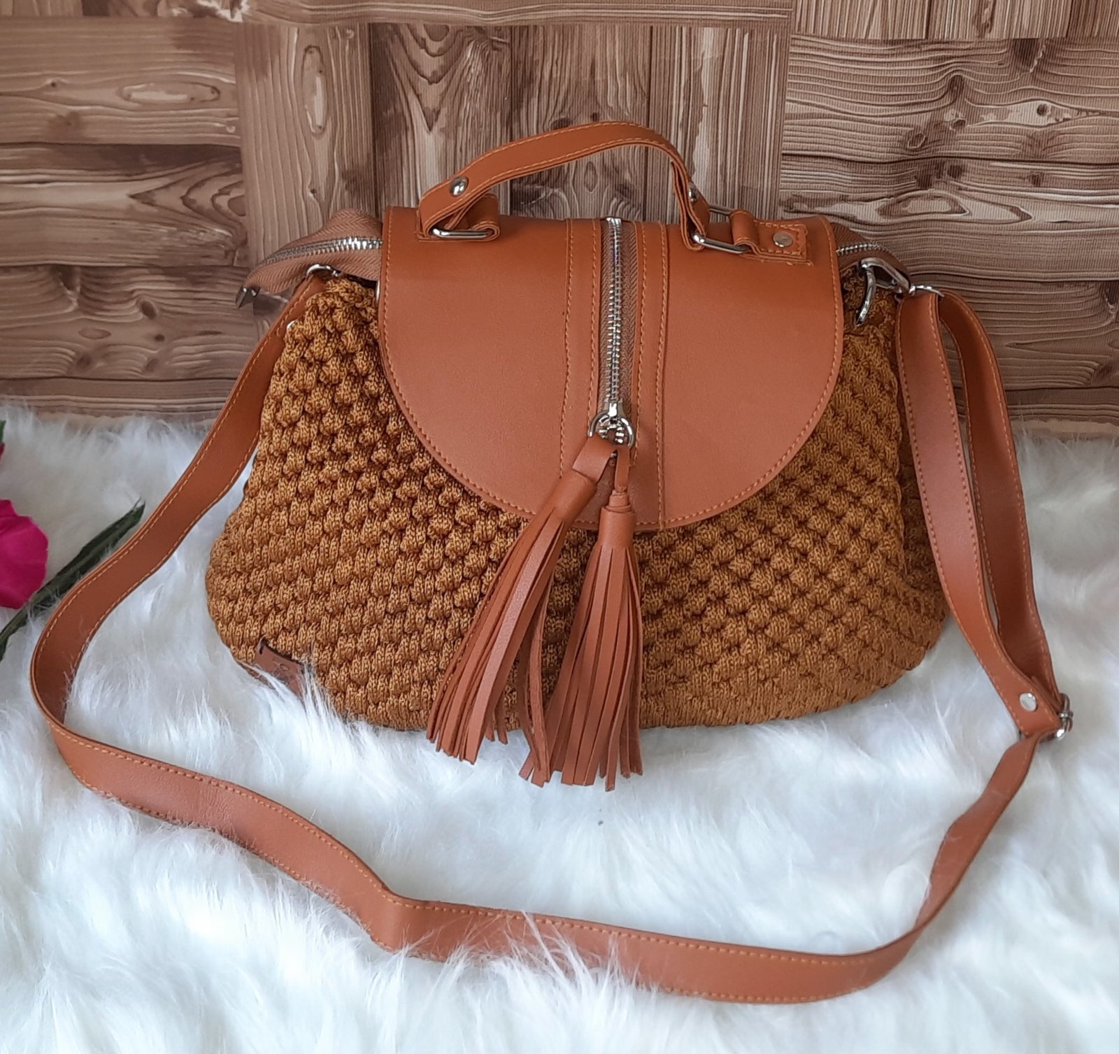 شنطة كروشيه يدوي بتصميم عصري مميز، تجمع بين الجلد والكروشيه البارز، مزودة بيد طويلة وحمالة ظهر لتناسب جميع استخداماتك اليومية وتضفي لمسة من الأناقة العملية.