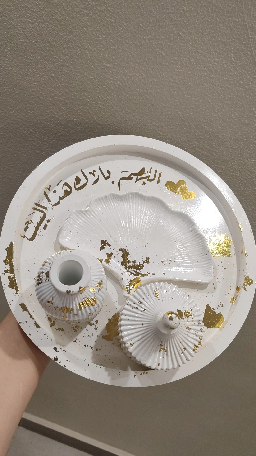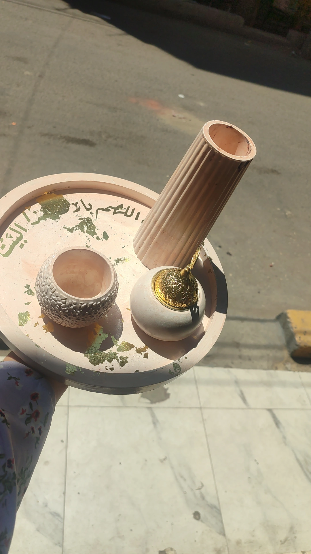 أضيفي لمسة من الفخامة والرقي إلى منزلك مع طقم العروسة المصنوع من الكونكريت والمزين بتفاصيل ذهبية أنيقة.