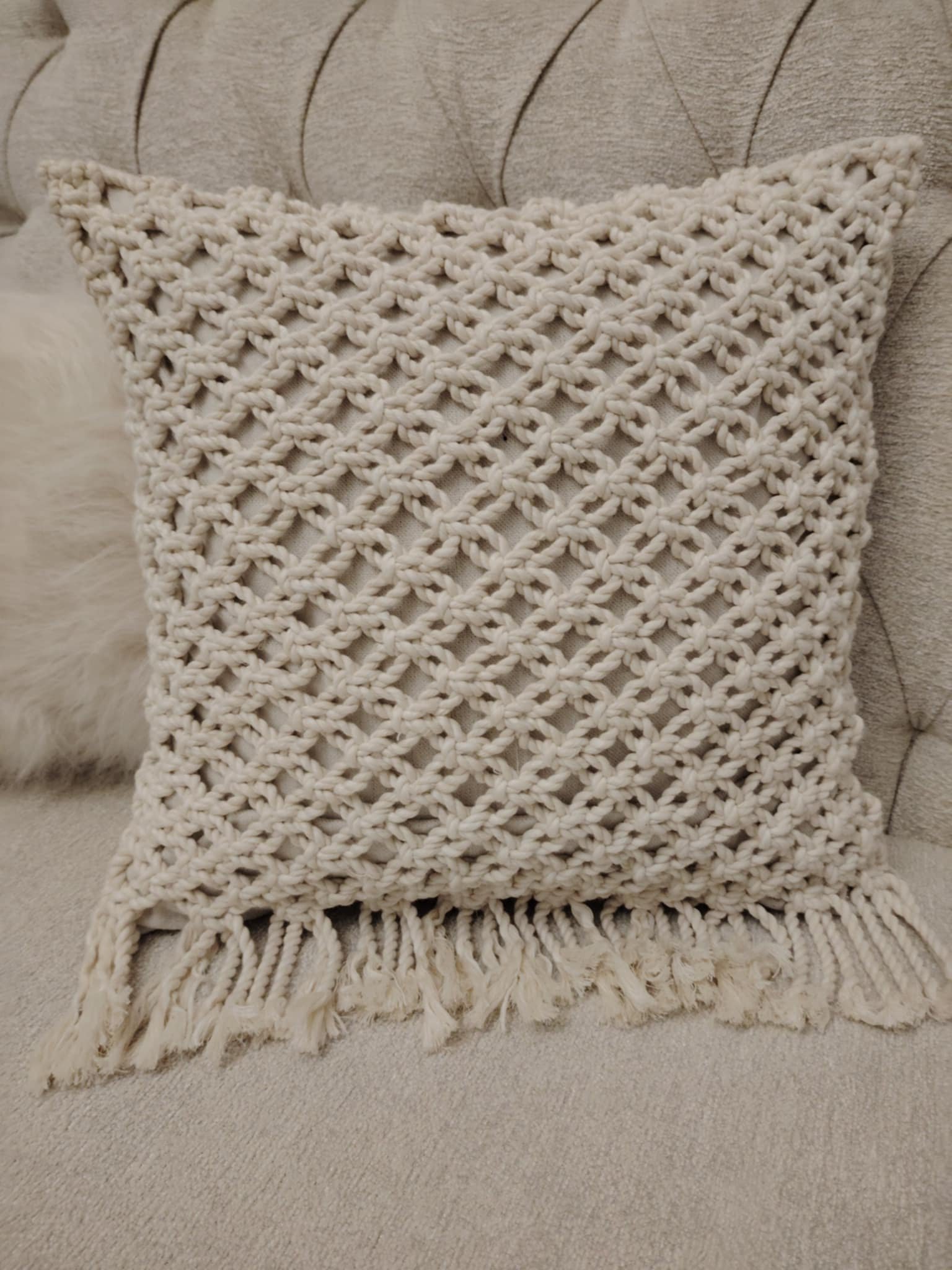 لون أوف وايت مقاس 40×40 سم بتصميم أنيق يضيف لمسة طبيعية ودافئة لديكور منزلك. الكوشن مصنوع يدويًا بخيوط المكرمية القطن عالية الجودة ليمنحك مزيجًا من المتانة والجمال، مما يجعله قطعة ديكور مثالية لغرفة المعيشة، غرفة النوم أو حتى كهدية فاخرة لمحبي اللمسات اليدوية. يتميز بلونه الأوف وايت العصري الذي يتماشى مع مختلف أنماط الديكور، ليضيف لمسة هادئة وبسيطة تجمع بين الأصالة والفخامة.