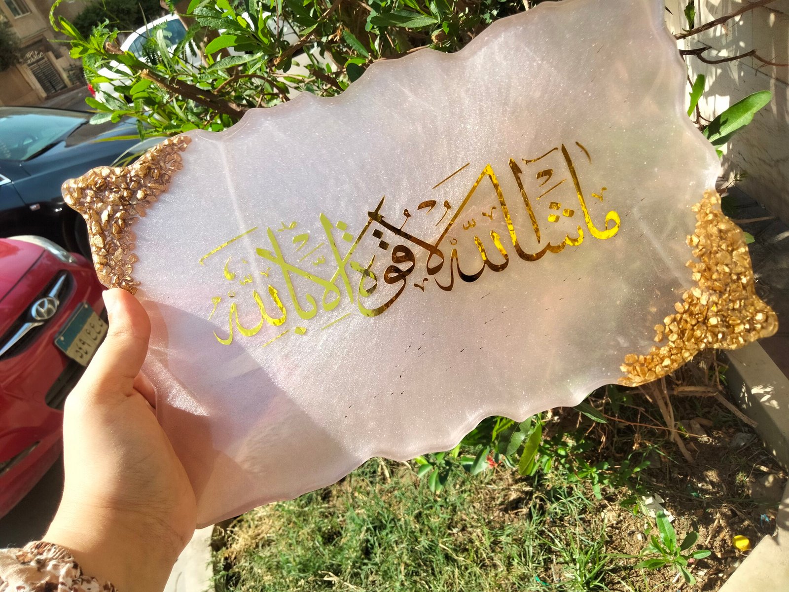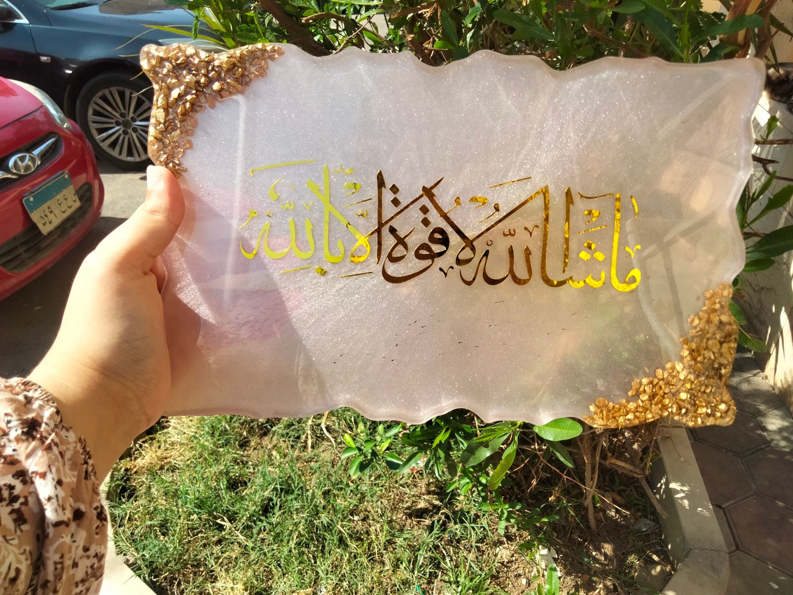 لوحة فنية من الريزن مزينة بحواف ذهبية أنيقة، تتوسطها عبارة “ما شاء الله لا قوة إلا بالله”، قطعة مميزة للديكور والاقتناء