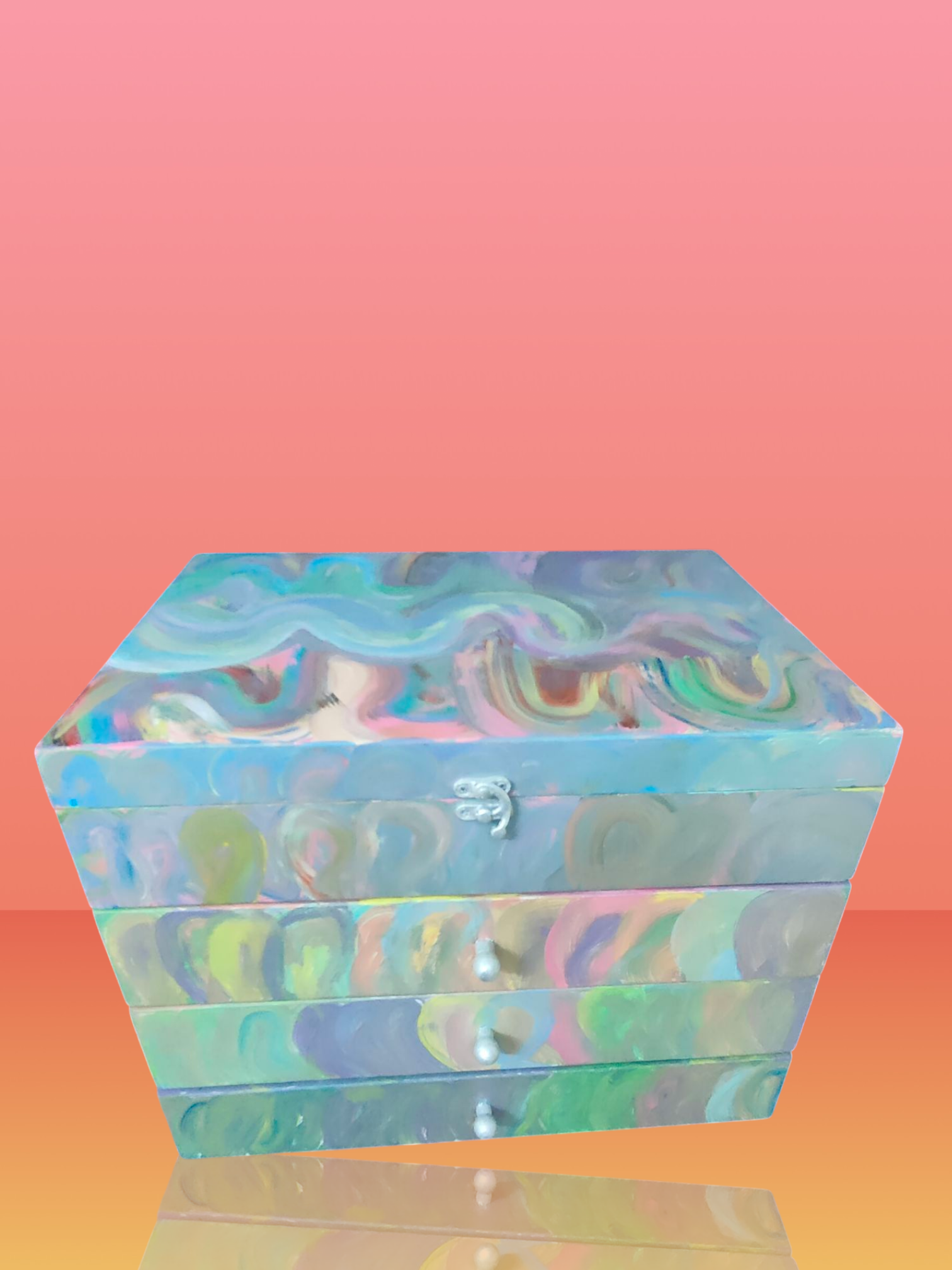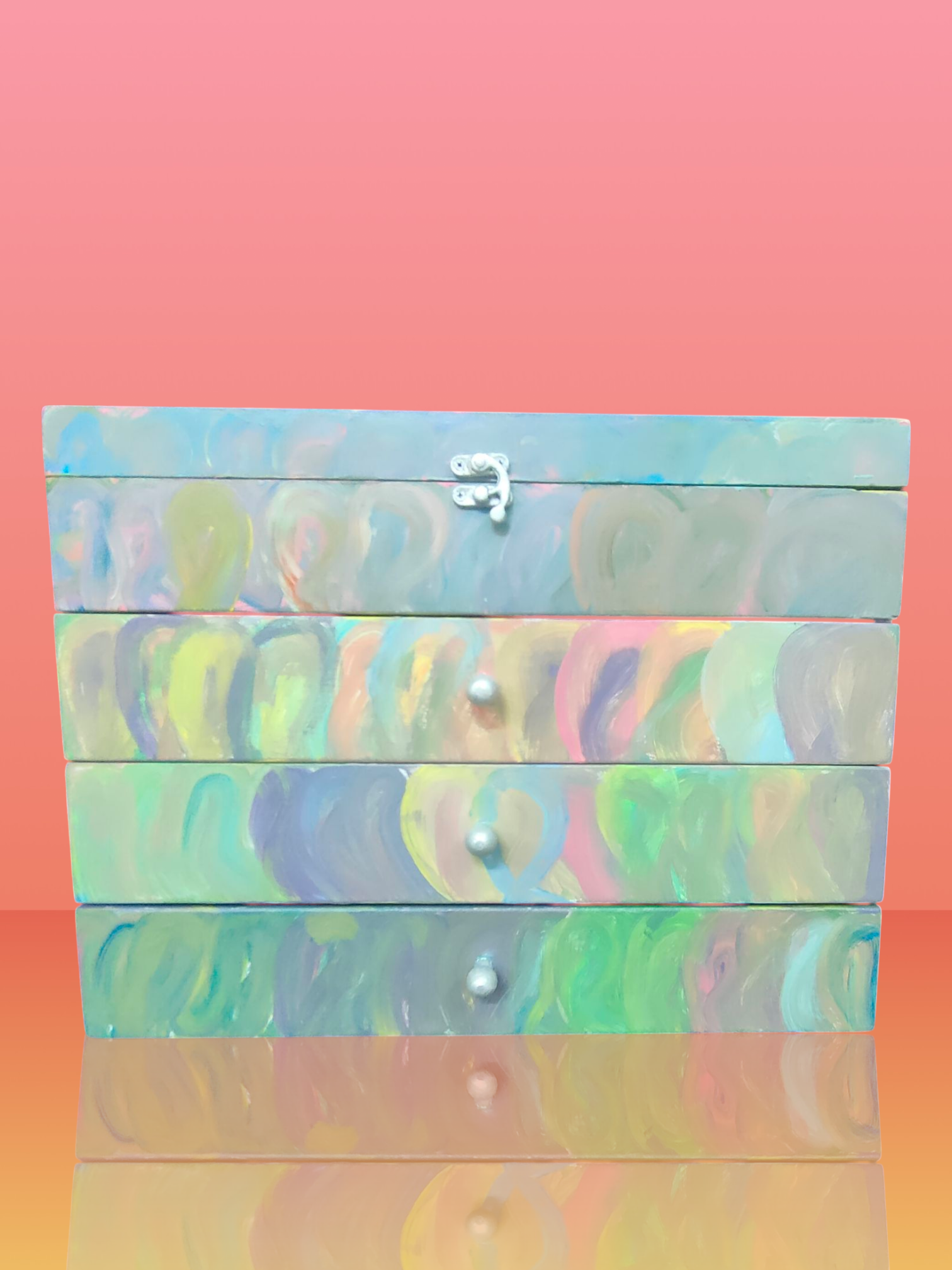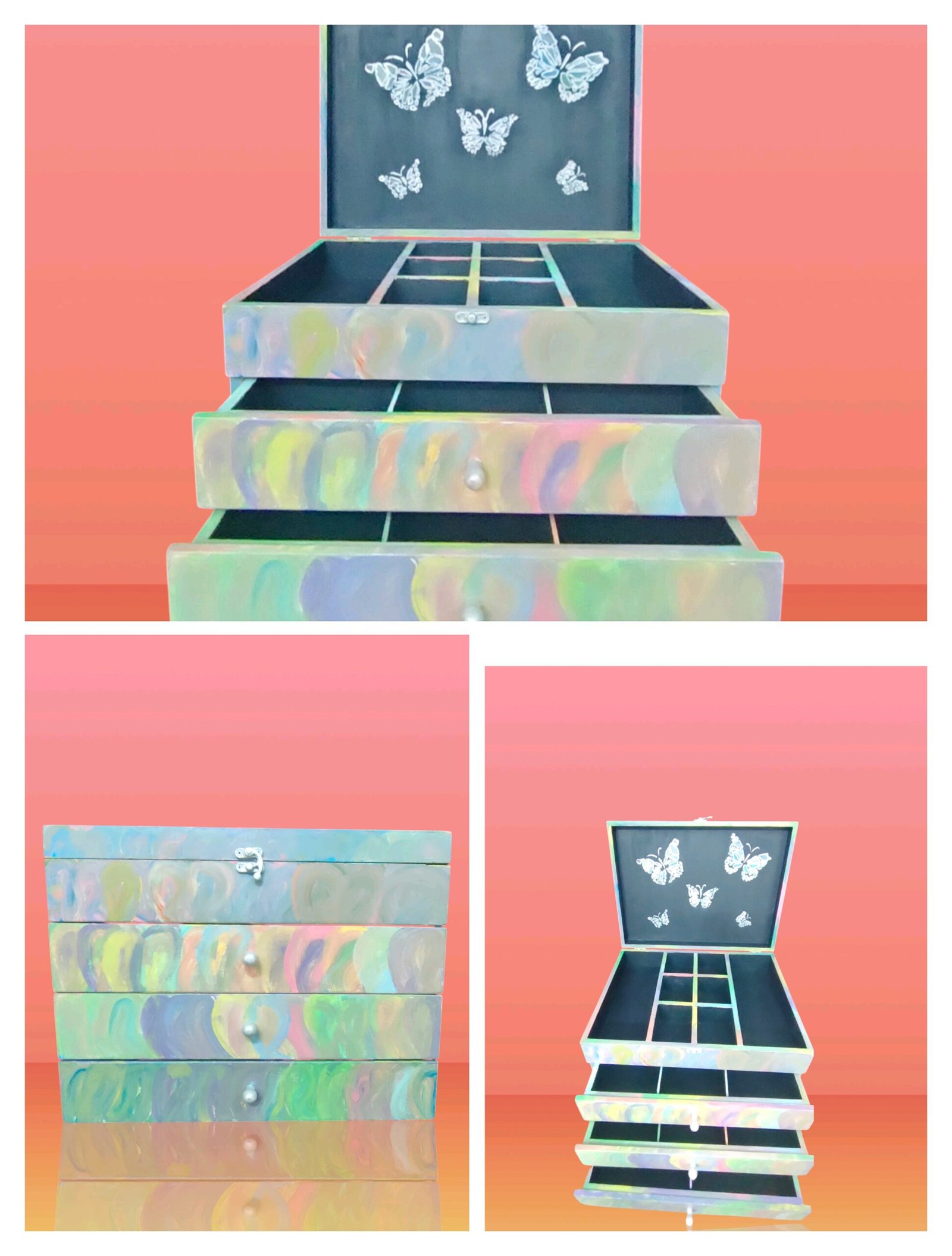 علبة إكسسوارات هاند ميد فاخرة بحجم كبير تجمع بين العملية والفخامة. مصنوعة يدويًا بعناية لتوفر لك مساحة مثالية لحفظ وتنظيم الإكسسوارات والمجوهرات. تحتوي على أربع أدراج مقسمة بشكل منظم يسهل الوصول إلى أغراضك مع الحفاظ عليها بأمان. تصميمها الأنيق يجعلها قطعة مميزة لتزيين غرفة النوم أو لتكون هدية قيمة لمحبي الأناقة والترتيب.