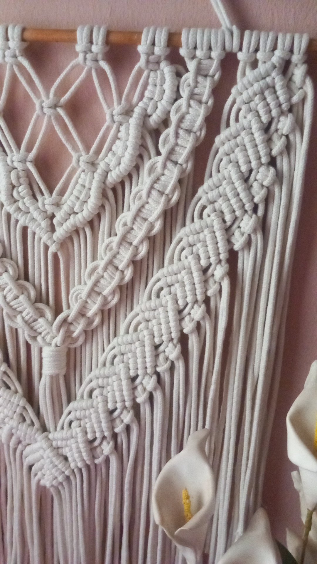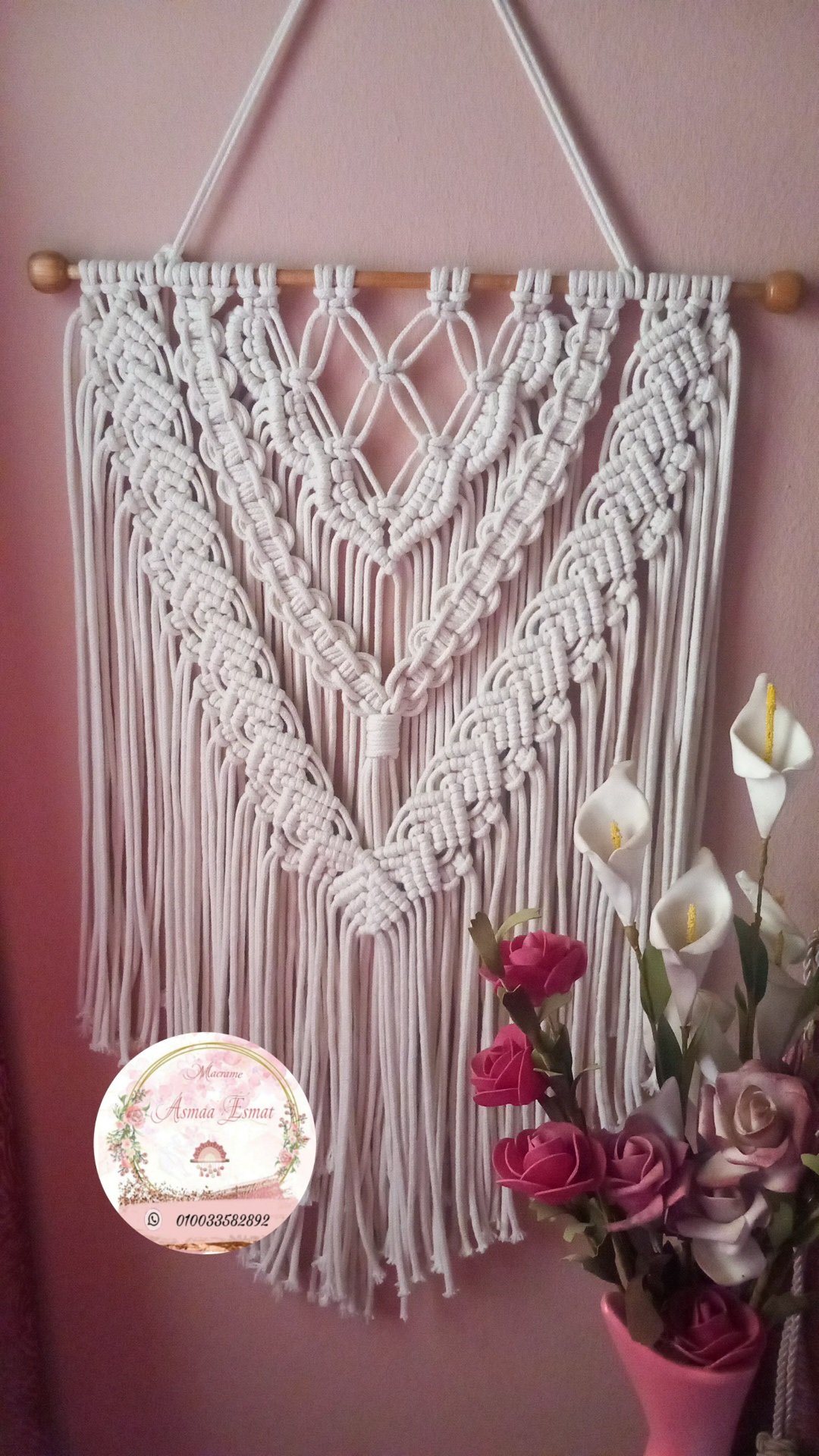 جداريه مكرميه أنيقة مصنوعة يدويًا بخيوط الكردون المحشي الفاخر وعُقد المكرميه المتقنة.